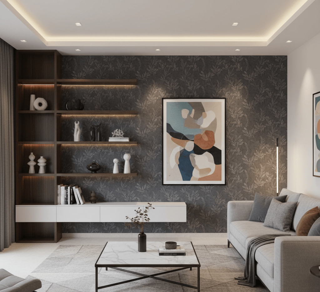 @ Key Features: Textured paint finishes, natural stone cladding, exposed brick walls, elegant wallpapers (often with botanical or geometric prints), and integrated art displays or custom shelving.